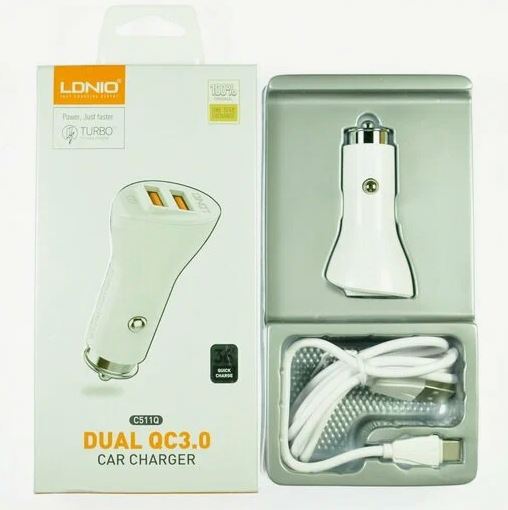 Автомобильное зарядное устройство LDNIO - одновременная зарядка двух устройств, с кабелем в комплекте