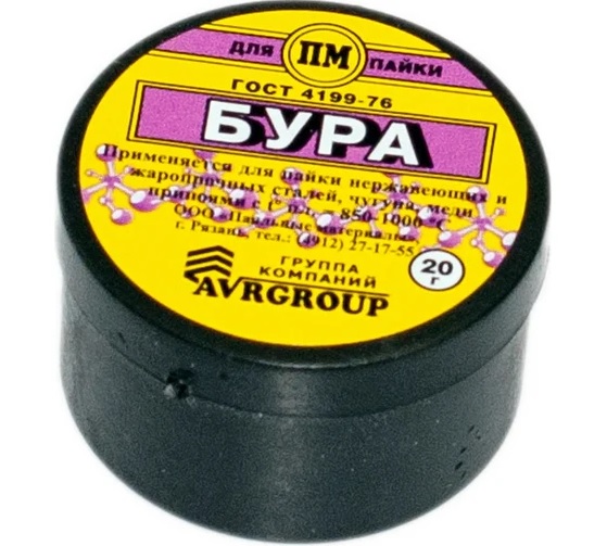 Бура – это флюс, используемый при соединении металлических деталей методом пайки. Бура, которая выпускается в виде порошка, относится к категории высокотемпературных флюсов, поскольку температура ее плавления находится в интервале 700–900°. Порошок буры, характеристики которого оговариваются в соответствующем нормативном документе (ГОСТ 8429-77), хорошо растворяется в воде и при нагревании превращается в стеклянную массу, которая и обеспечивает защиту зоны пайки. Бура, представляющая собой соль, в состав которой входит слабая борная кислота и сильное основание, имеет и научное название – декагидрат тетрабората натрия. При помощи этого вещества, используемого в качестве флюса, выполняется пайка таких металлов, как сталь, чугун, медь и ее сплавы. При этом для такой пайки используются среднеплавкие припои, основу которых могут составлять медь, латунь, серебро и золото. При расплавлении буры, что происходит при достаточно высокой температуре, поверхности соединяемых деталей очищаются, а окислы, которые на них присутствуют, растворяются в разогретом флюсе. В процессе выполнении пайки, для которой используется такой тугоплавкий флюс, как бура, соответствующая требованиям ГОСТа 8429-77, образуются соли, кристаллизирующиеся на поверхности формируемого соединения. После завершения технологической операции соляной налет необходимо удалить.